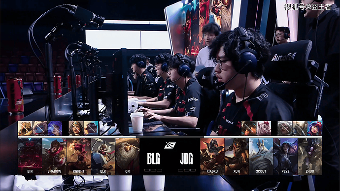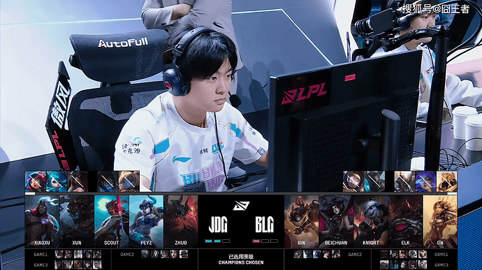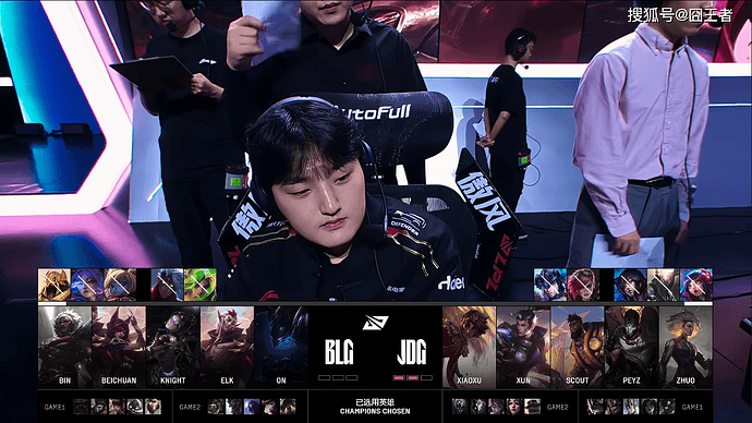 第一局比赛,BLG蓝色方,禁用:沙皇、波比、芸阿娜、希维尔、布隆,选用:Bin奥恩、shad0w猴子、Knight安妮、Elk飞机、ON巴德;JDG红色方,禁用:妮蔻、潘森、安蓓萨、洛、泰坦,选用:Xiaoxu兰博、Xun皇子、Scout加里奥、Peyz卡莎、Zhuo牛头