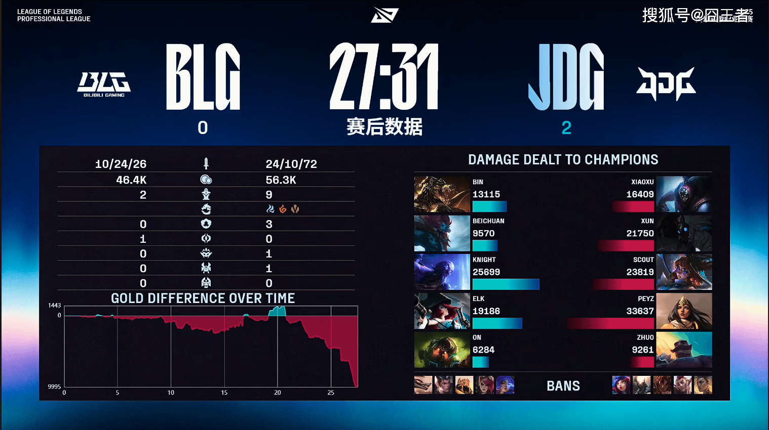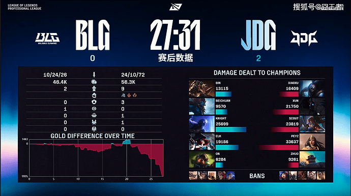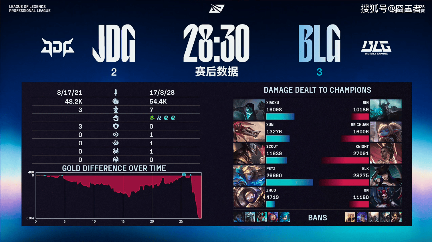 结果决胜局的比赛,囧王者只能说,JDG有人在犯罪,BLG简单速通局。4分钟左右,中路Knight梅尔配合Beichuan波比击败纳亚菲利,拿下一血;15分钟左右,峡谷先锋处JDG先手开团,但Beichuan波比冷静应对,Elk凯特琳拿下双杀;26分钟左右,双方争夺小龙,Beichuan波比抢下小龙,BLG拉扯出色打出一换二;最终28分30秒,BLG控下大龙并打出零换二,BLG持续推进团灭JDG后推平基地赢下比赛。