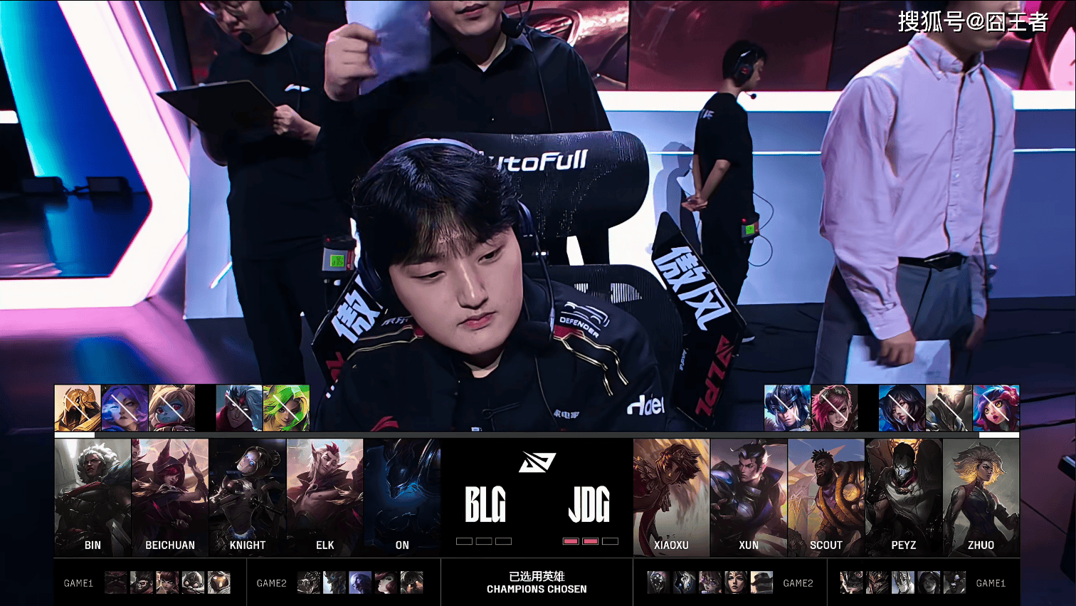 第二局比赛,BLG蓝色方,禁用:芸阿娜、蔚、沙皇、赵信、纳亚菲利,选用:Bin鳄鱼、beichuan巨魔、Knight瑞兹、Elk女枪、ON泰坦;JDG红色方,禁用:妮蔻、潘森、岩雀、洛、芮尔,选用:Xiaoxu贾克斯、Xun千珏、Scout阿萝拉、Peyz希维尔、Zhuo布隆
